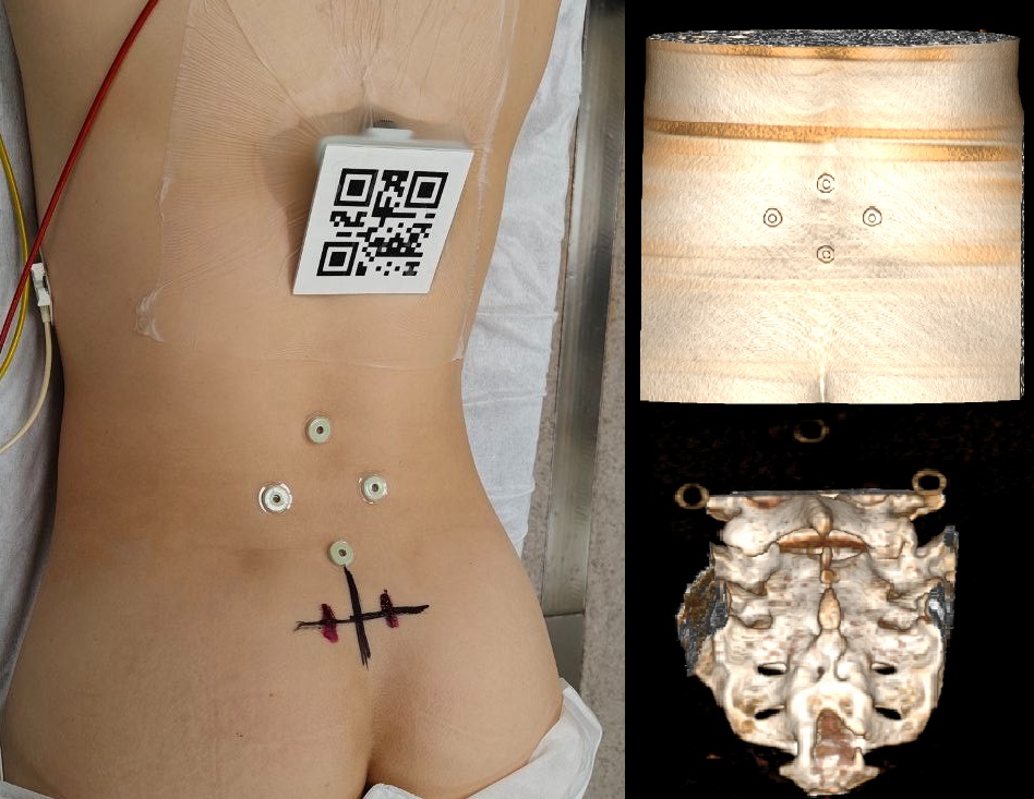 Перед выполнением вмешательства каждому пациенту проводилось предоперационное КТ-сканирование соответствующей анатомической зоны с предварительной установкой рентгеноконтрастных ориентиров (fiducial markers). При подготовке к процедурам сакральной нейростимуляции (SNRS) выполнялась КТ пояснично-крестцового отдела позвоночника, а четыре метки устанавливали в ромбовидной конфигурации в проекции поясничной области (Рисунок 1).