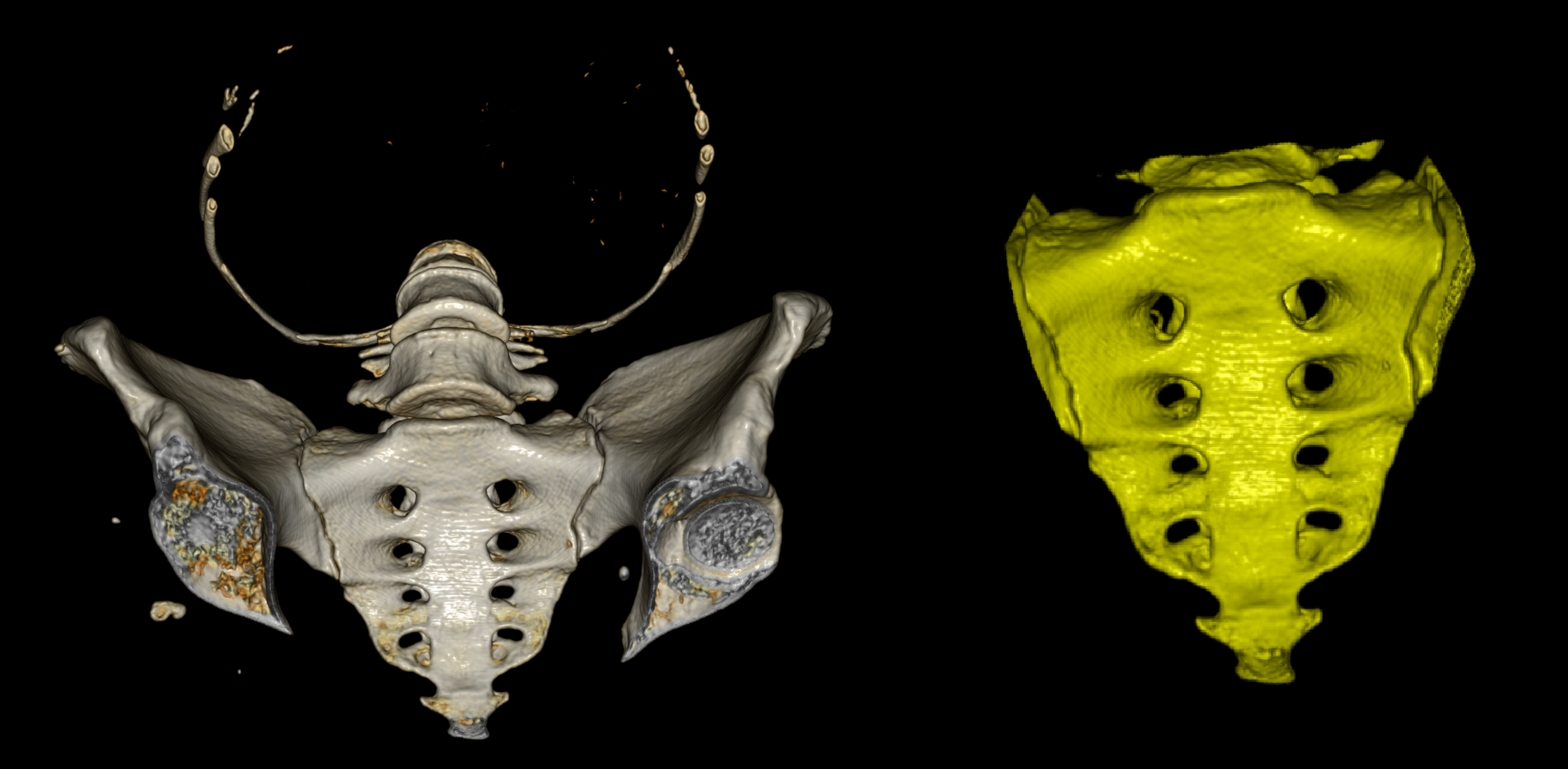 Рисунок 2. Создание 3D модели и её сегментация в Inobitec DICOM Viewer для последующей обработки. Слева – 3D реконструкция интраоперационного КТ. Справа – сегментированная модель поверхности крестца.