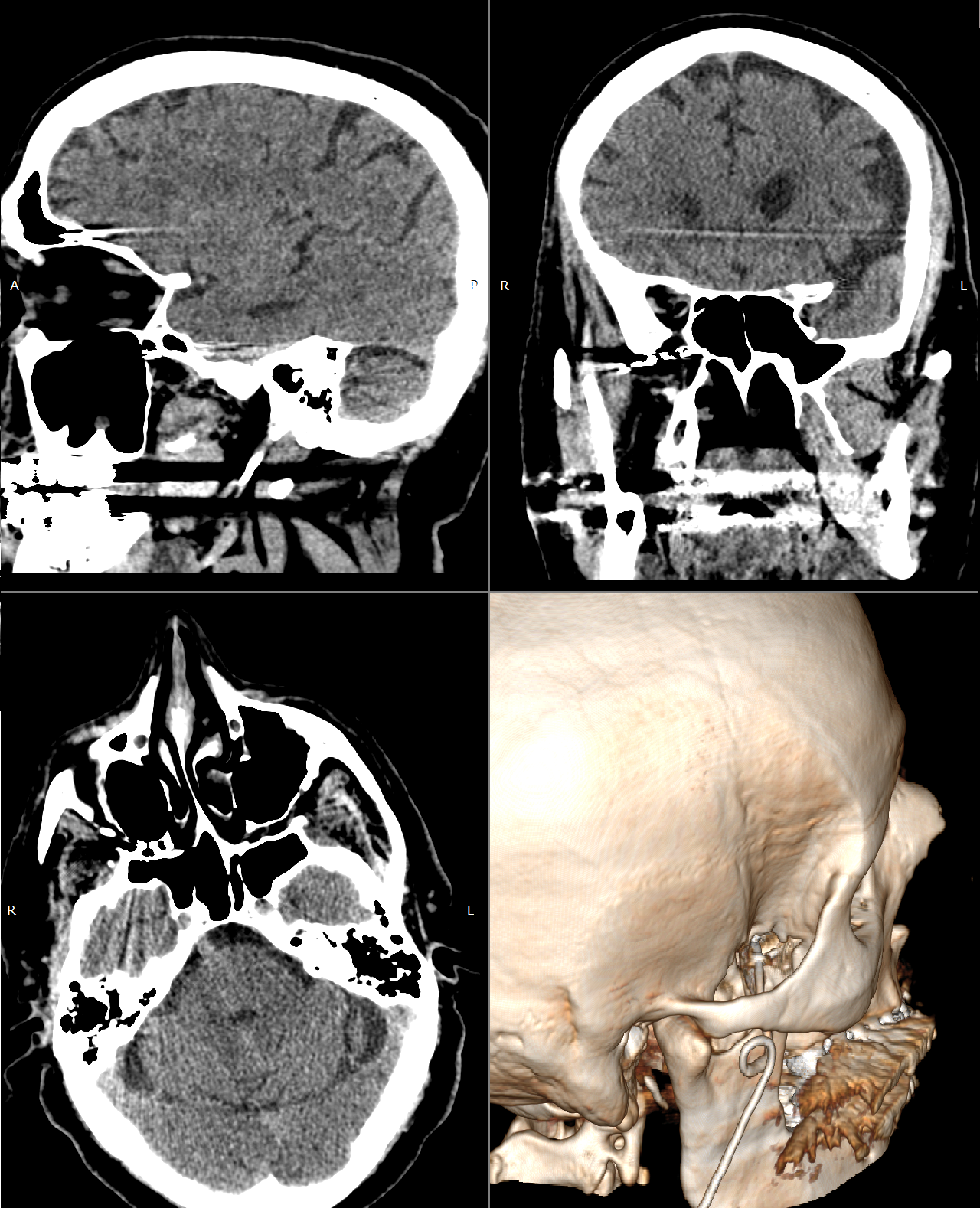 При выполнении данной операции применение навигации с дополненной реальностью оказалось даже более результативным. Точное следование заранее рассчитанной траектории введения инструмента (рис. 6) обеспечило оптимальное расположение электрода в крылонёбной ямке, что впоследствии сопровождалось выраженным положительным клиническим результатом. Корректность положения стимуляционной иглы была подтверждена интраоперационной флюороскопией, после чего произведена имплантация четырёхконтактного электрода. Финальная позиция системы была дополнительно верифицирована по данным послеоперационной компьютерной томографии (рисунок 7).