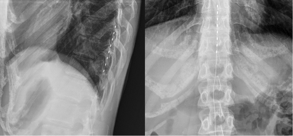 Рисунок 1. Рентгенологическая картина имплантированного электрода в заднее эпидуральное пространнство на уровне Th10-Th12 позвонков.