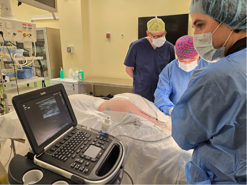 Рисунок 2. Фото из операционной. Имплантация электрода на икроножный нерв под УЗИ-контролем.