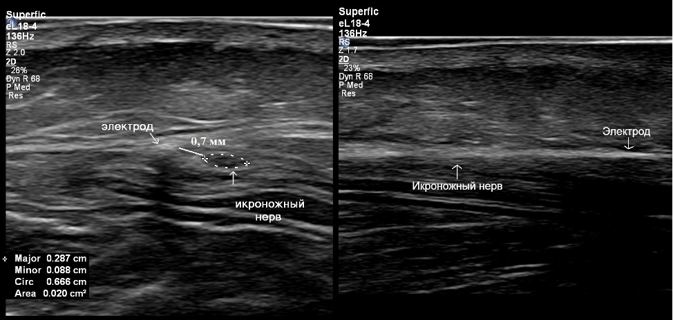 Рисунок 3. УЗ-картина имплантированного электрода. Слева – поперечное сканирование: электрод и икроножный нерв подписаны. Видно, что электрод идёт вдоль ствола икроножного нерва на расстоянии от него менее 1 мм. Справа – продольное сканирование: вывести электрод и нерв в одну плоскость крайне затруднительно из-за их взаимного расположения, но можно визуализировать тень от электрода и эпиневрий икроножного нерва.